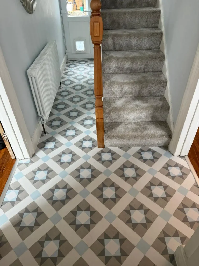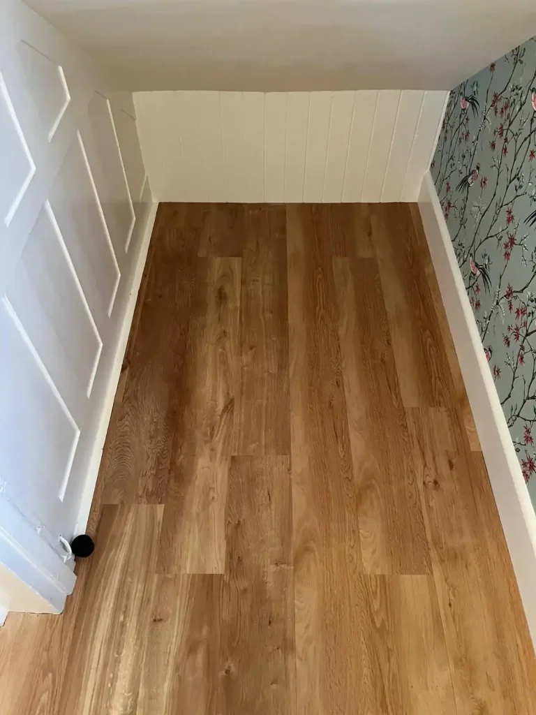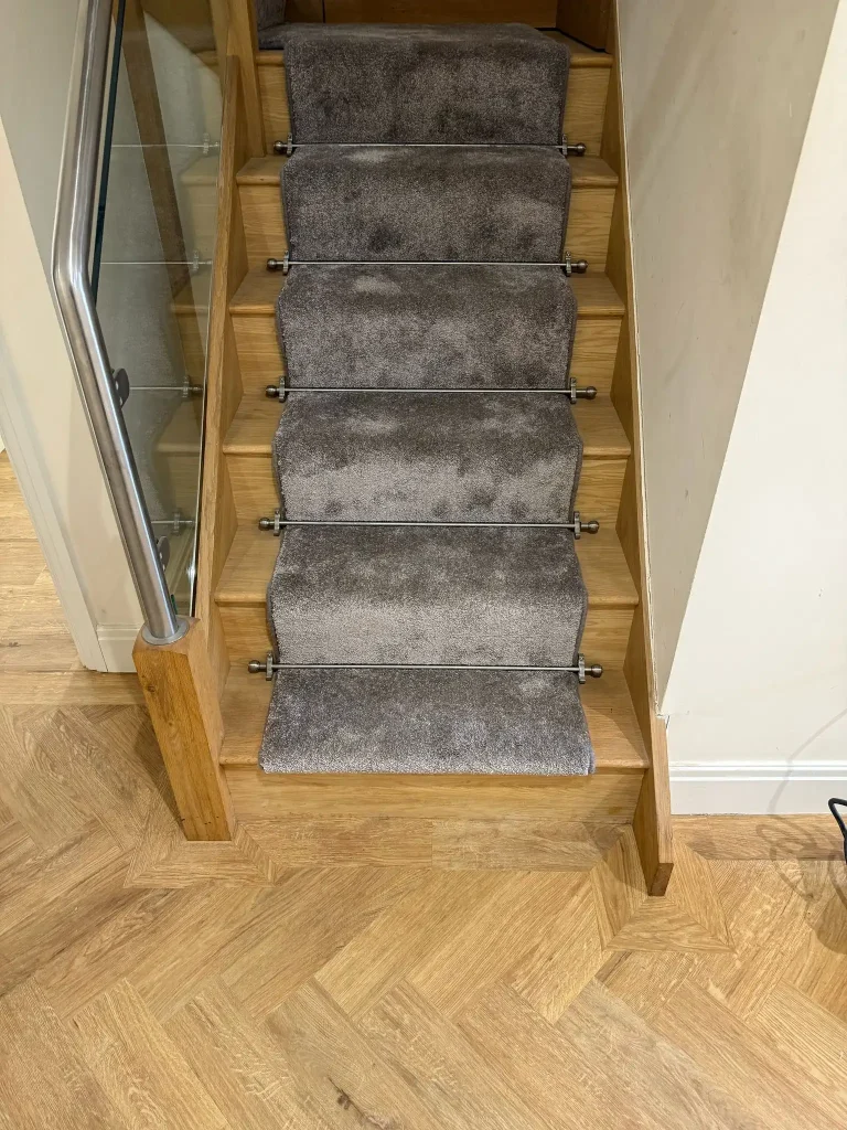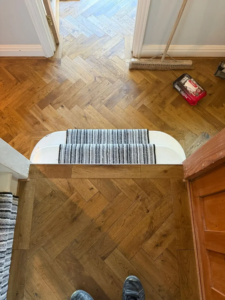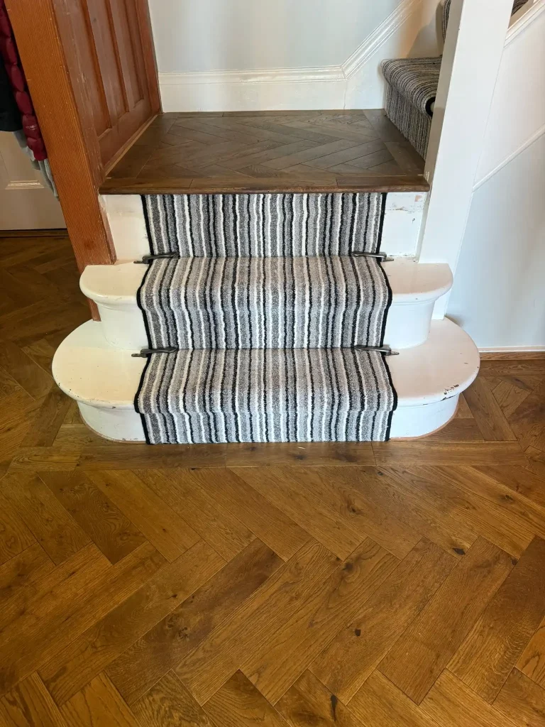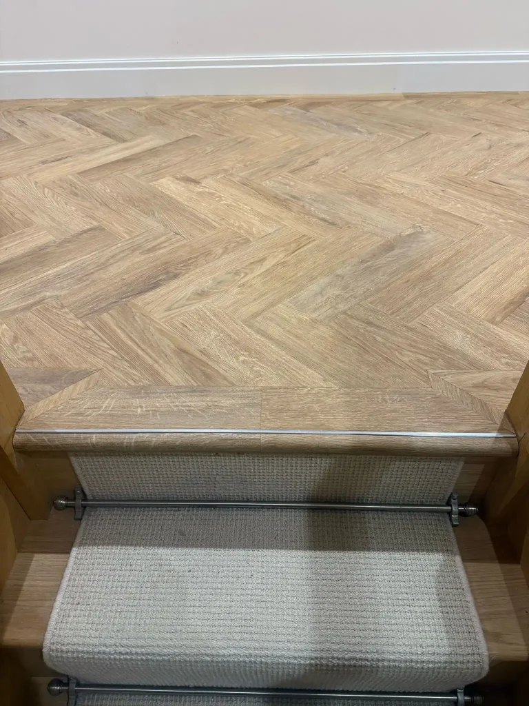 Residential - Karndean Van Goag - Parquet Flooring fitted Herringbone style with 1 piece border - Finished bullnose in LVT - Carpet whipped with metal stair rods